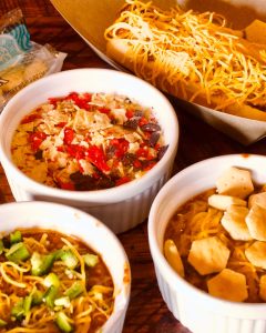 Chili Flight of three bowls of chili! White Chili, Southwest Chili, and our version of Cincy Chili. Each with their own toppings and served with oyster crackers.
