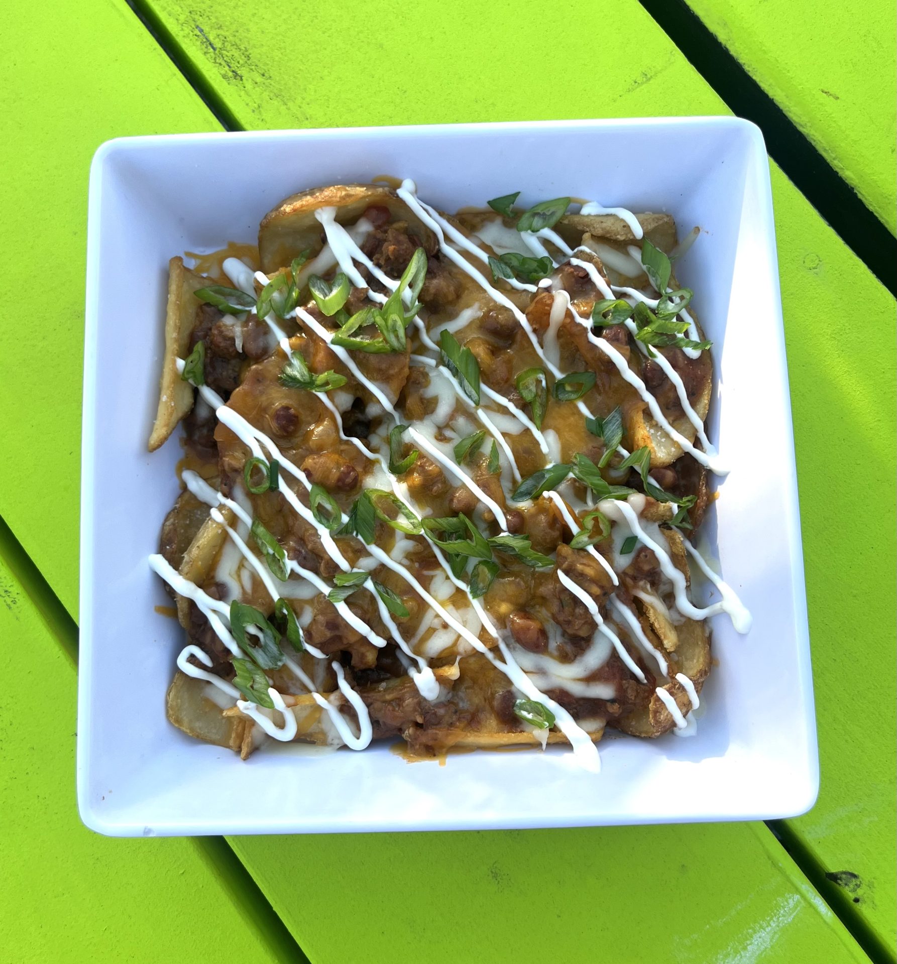 Premium angus chuck chili, spiral cut potatoes, topped with shredded cheddar cheese, sour cream & green onion